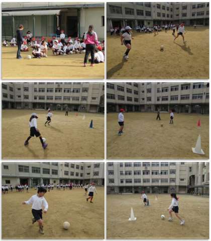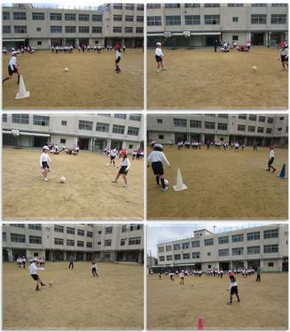 2年生の体育の学習です。サッカー型ゲームに取り組んでいます。画像は、2人でボールをパスをしながら、コーンを回ってくる練習を行っているところです。