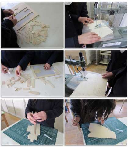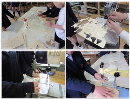 5年生の図画工作の学習です。木工パズルの作製に取り組んでいます。電動のこを使って、ていねいに切っています。