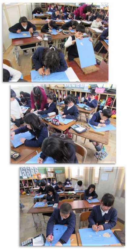 4年生の図画工作の学習です。木版画で、彫刻刀を使って彫り始めています。
