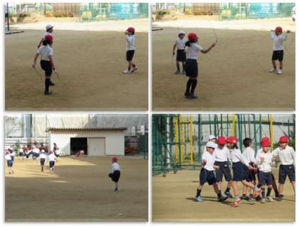 1年生の体育の学習です、1年生の子どもたちが縄跳びをしています。前回し跳びを、続けて何回も跳んでいます。駆け足跳びをしている子もいるようです。