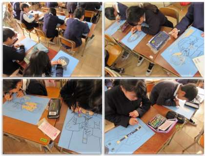 4年生の図画工作の学習です。木版画に取り組んでいます。彫刻刀の使い方にも慣れ、細かく彫ることができるようになってきました。