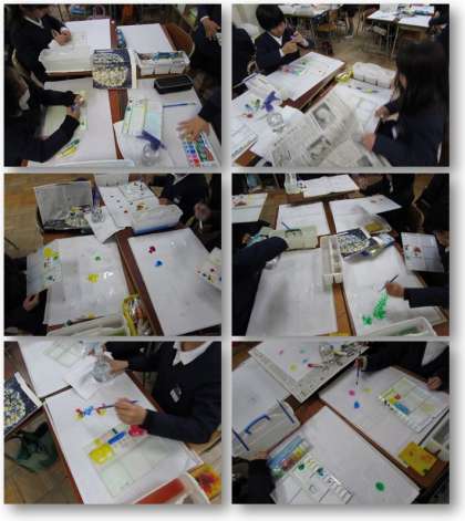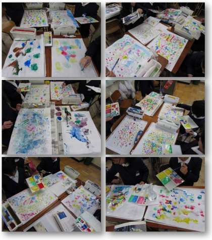 お話の世界を想像した後、子どもたちはそれぞれが思い描いた「モチモチの木」を表現していきました。霧吹きを使って湿らせた和紙に、絵の具を落としていきます。垂らした絵の具がにじみ、広がっていく様子がとてもおもしろかったです。