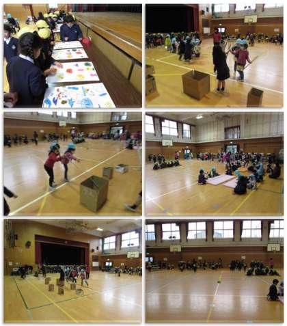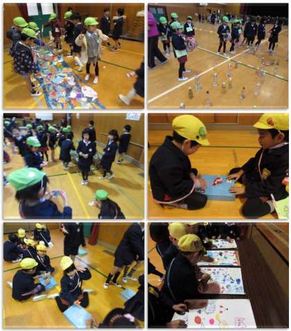 本日、1年生は保育所・幼稚園の子供たちを招いて、遊び交流会を行いました。1年生の子どもたちは、おもちゃを手作りし、ポスターを作り、役割分担を決めて今日の交流会に臨みました。来年、1年生になる子どもたちに、小学校の楽しさを伝えようと、頑張りました。1年前には『お客さん』だった子どもたちが、一生懸命におもてなしをしている姿に、1年間の成長を感じさせられました。