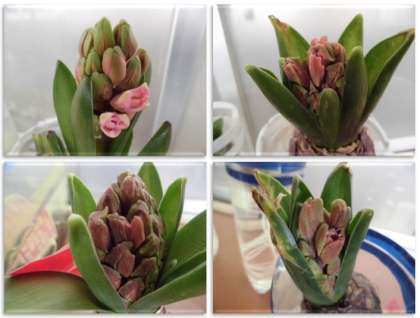 2年生が育てているヒヤシンスの花が、少しずつ咲き始めました。今年もピンク色の花が、一番に咲いているようです。