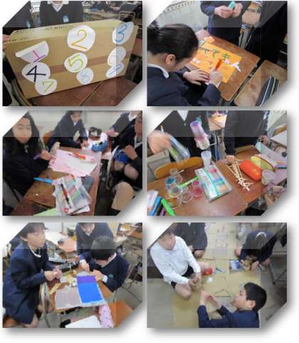 5年生は学級で「あそび大会」を行います。今日は、グループごとに遊び道具を作っていきました。