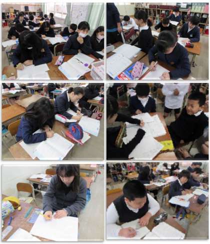 5年生の算数の学習です。今日は「円と正多角形」の復習をしています。コンパスや分度器を使って正五角形・正六角形を描いたり、円周の長さを求めたりしました。