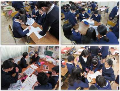 6年1組は明日、調理実習を行います。今日は各班で、調理実習の材料や手順、分担などを確認しました。