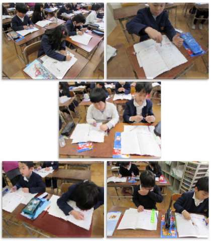2月14日(火) 3年生の算数の学習です。コンパスを使って、二等辺三角形や正三角形を描いています。