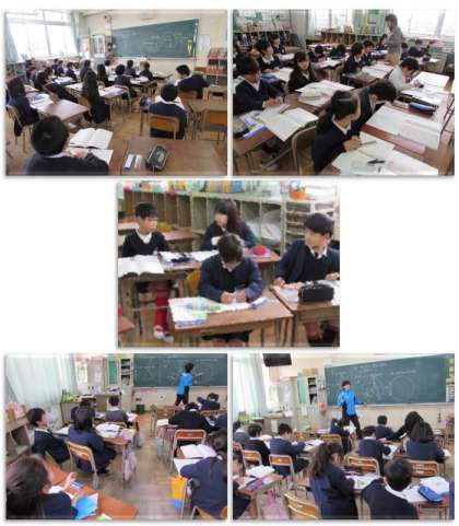 3年生の算数の学習です。円を使い、三角形を描いています。円の半径を三角形の二辺とすることで、二等辺三角形、正三角形が描けることに気づきました。