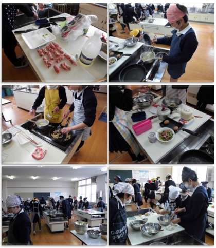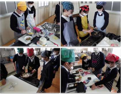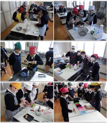 6年生の家庭科の学習です。お弁当を作りました。各班でお弁当の献立を考え、皆で協力して作っていきました。