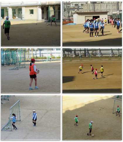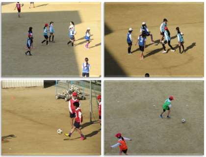 6年生の体育の学習です。運動場でサッカーの試合を行っています。