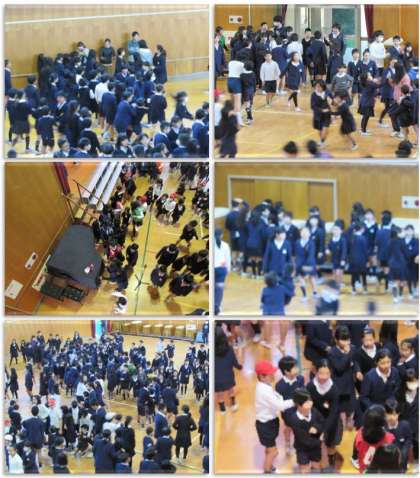 今日の児童集会は、集会委員会による「指令ゲーム」です。集会委員の言う「指令」に、子どもたちはこたえていきます。「ペアと手をつないで10回ジャンプ」「ペアとじゃんけん」「まわりの先生とタッチ」「壁や跳び箱にタッチ」と、次々と指令が出され、子どもたちはペアで活動していきました。