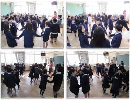 3年生の道徳の学習です。友達と背中合わせになって腕を組み、そのままの姿勢で立ち上がったり、4人組、8人組になって、先生の指示に合わせて皆で一緒に右に飛んだり左に飛んだり前に跳んだり、手と手を打ち鳴らしたりしました。