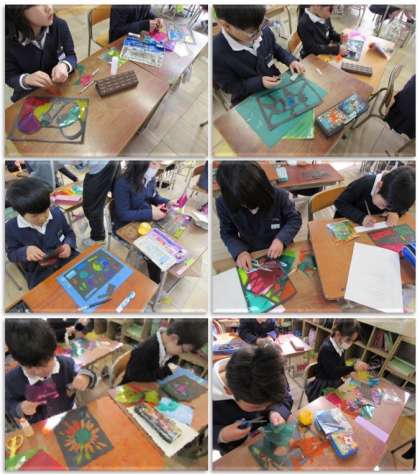 2年生の図画工作「ひかりのプレゼント」です。黒い画用紙を切り抜いたところに、カラーセロハンを貼っていきました。