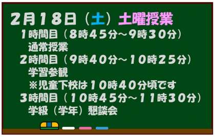 明日2月18日(土)は、3学期2回目、そして今年度最後の土曜授業です。1時間目は通常授業、2時間目が学習参観、3時間目は懇談会(学級または学年)となっています。懇談会では、今年度のまとめを、そして新年度に向けてのお話ができればと考えています。多数の皆様のご参会をお待ちしております。