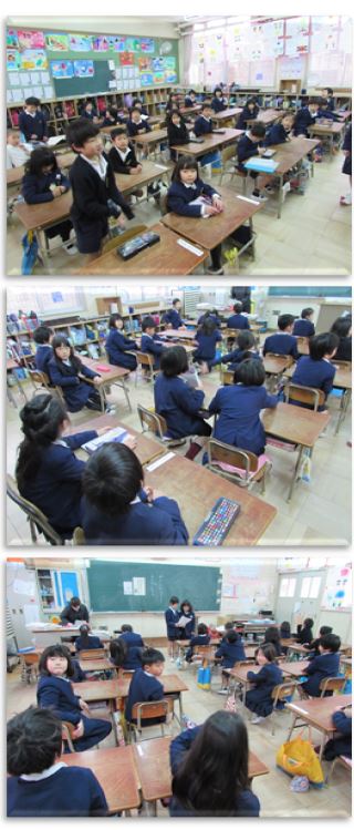 1年生の朝の会の様子です。昨日の出来事や今日の予定、先生からのお知らせなどが主な内容です。
