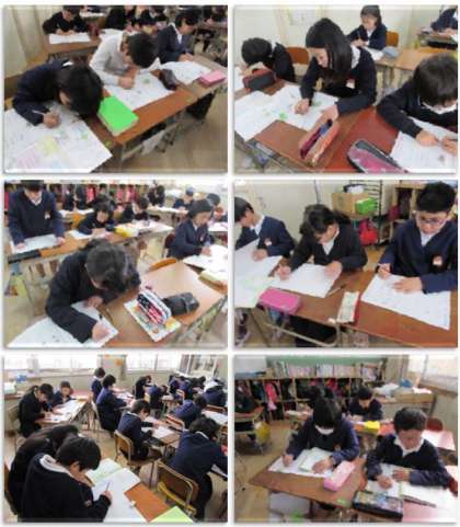2月23日(木) 4年生の硬筆書写の学習です。フェルトペンや鉛筆を使って、ていねいに書きました。