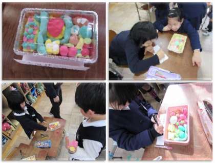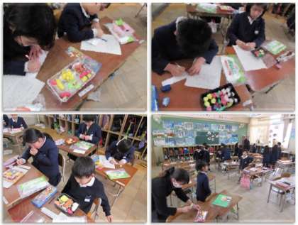 2年生の図画工作の学習です。紙粘土でお弁当を作りました。そして、自分のお弁当作りの工夫したところを書きました。今日、子どもたちはそれぞれのお弁当を鑑賞していきました。