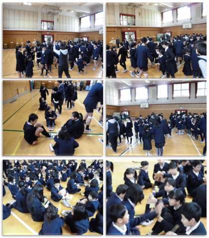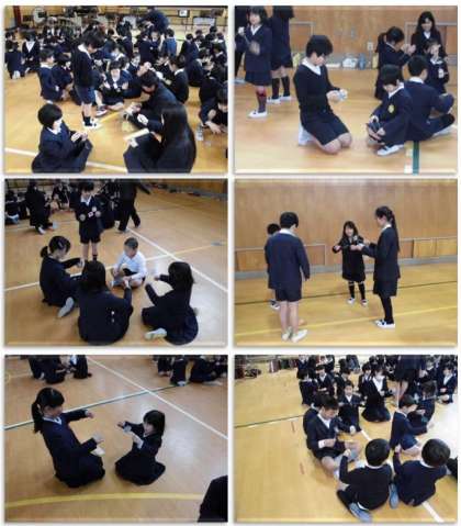 音楽発表の後、1年生から6年生へ、びゅんびゅんごまをプレゼントしました。1年生が6年生に回し方を教えてあげている様子もあり、とてもあたたかい気持ちになりました。