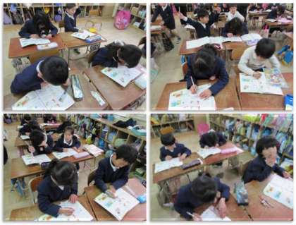 1年生の算数の学習です。時計を読む学習を行っています。何時何分か、読む学習です。ご家庭でも、お声掛けをお願いいたします。