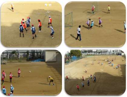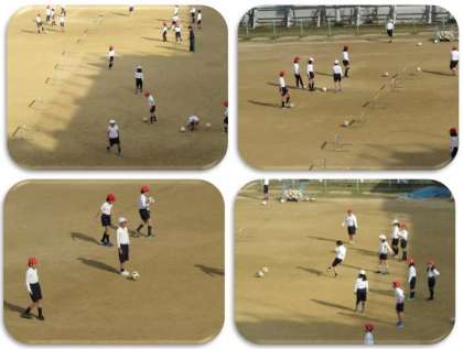 5年生の体育の学習です。初めにハードルを置いて、その間を通してパスをする練習を行いました。続いて、チームに分かれ、ゲームを行いました。