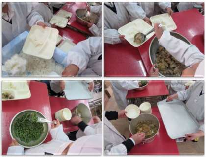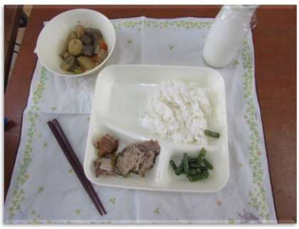 本日の献立は、ご飯、豚肉の甘辛焼き、三色あげ天と野菜の煮物、さんどまめの胡麻和え、牛乳でした。