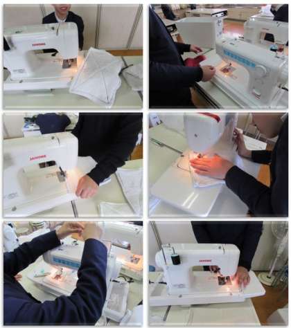 明日の1時間目、「卒業おめでとう集会」を行います。そこで6年生は、在校生に雑巾をプレゼントします。家庭科室では、6年生がミシンを使って、雑巾を縫っていました。
