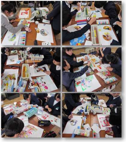 6年生の図画工作の学習です。カップ麺のふたや、お菓子のパッケージを半分にし、残り半分を補う形で描いています。色合い、光の入り方なども工夫して『本物そっくりに』描くことが目標です。