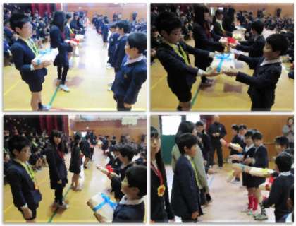 プログラム7番は、6年生から在校生へのプレゼントです。6年生からは、手作りの雑巾がプレゼントされました。毎年、雑巾がプレゼントされ、学校を美しくする、すすんで掃除をしようとする気持ちも、受け継がれていきます。