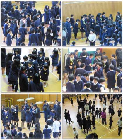 プログラム8番は、集会委員会によるゲームです。集会委員の指示に従って、6年生とハイタッチをしたり、じゃんけんをしたり、好きな果物を聞いたりしました。