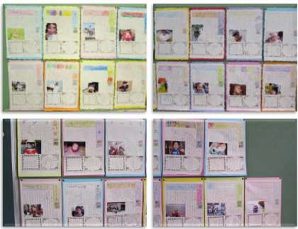 2年生の教室の後ろに、生活科で作った「せいちょう新聞」が掲示されています。そこには、2年生でできるようになったことや家族への思い、自分の名前の由来、また、写真とそれにまつわるエピソードが書かれています。