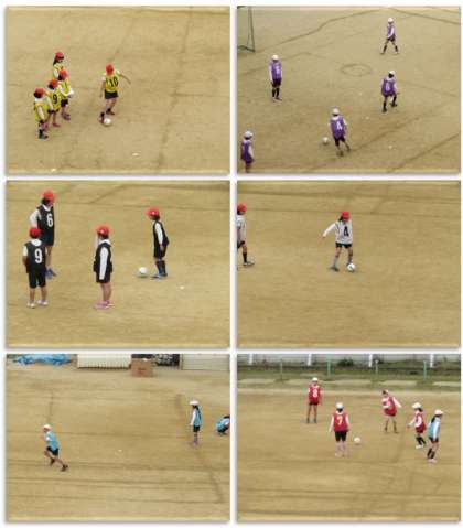 4年生の体育の学習です。サッカー型ゲームで、パスやシュートの練習に取り組んでいるところです。今日はこの後、ゲームを行いました。