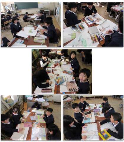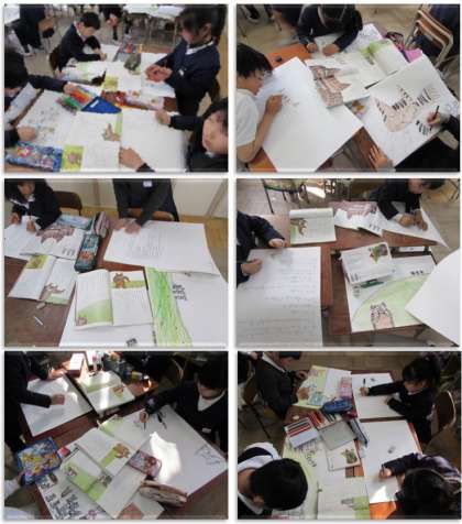 2年生の国語「ニャーゴ」の学習です。今日は班ごとに、紙しばいを作っています。班のメンバーで、場面を分け、絵とお話をかいていきました。