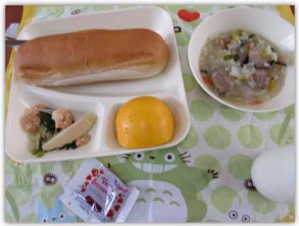 本日の献立は、コッペパン、牛乳、いちごジャム、えびとチンゲンサイの炒めもの、中華がゆ、はっさくでした。