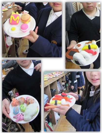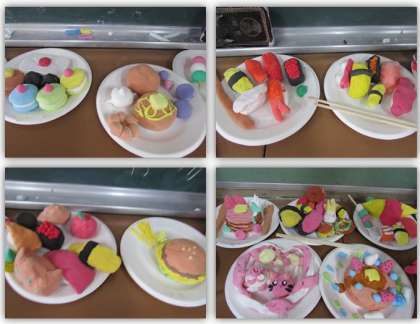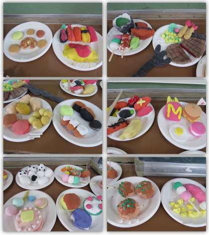 4年生の図画工作の学習です。紙粘土を使い、自分が食べたいな、と思うものを作りました。紙粘土に絵の具を混ぜ、色や、形を工夫して作りました。