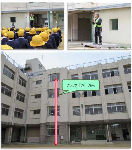 初めに、学校長の話です。昨夜、テレビ観戦をしていた熱戦のこと、3・4階の踊り場にある6年生の作品(本物はどれかな)のことを話しました。続いて、3月11日、東日本大震災のことについての話です。東日本大震災の津波が16.7mあり、それがどれぐらいの高さか調べようと、4階の窓から運動場までメジャーを垂らしてみたら、12.3mだったことを話しました。その話を聞いて、子どもたちは改めて津波の恐ろしさを感じていたようでした。