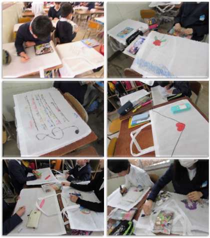 5年生の図画工作の学習です。一年間の作品を入れる作品袋に、絵を描いています。友達に、メッセージを書いてもらっている子もいました。