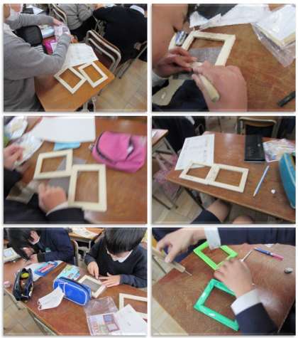 6年生の図画工作の学習です。写真立ての枠を彫っています。デザインし、彫刻刀でていねいに彫っていきました。