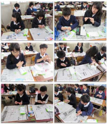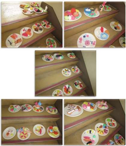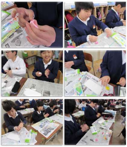 4年生の図画工作の学習です。紙粘土に絵の具を混ぜて色を作り、自分が食べたいな、と思うものを作りました。子どもたちの普段の食生活が、少し見えるような、楽しい作品です。