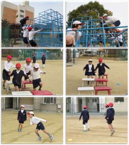 3年生の体育の学習です。運動場にサーキットを作りました。2人組の活動です。手押し車に始まり、鉄棒、キャッチボール、ジャングルジム、台の昇降、最後は反復横跳びです。