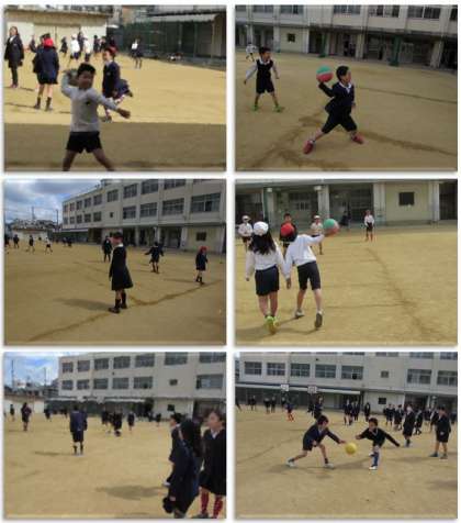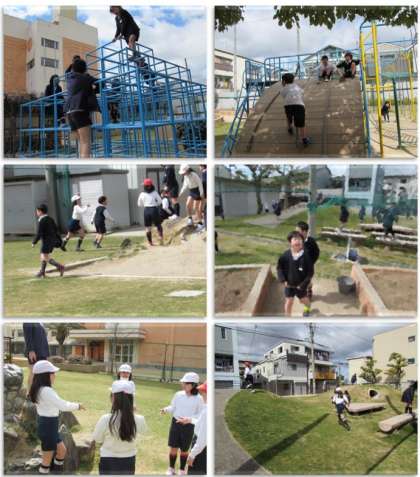 休み時間の運動場です。子どもたちが元気に遊んでいます。