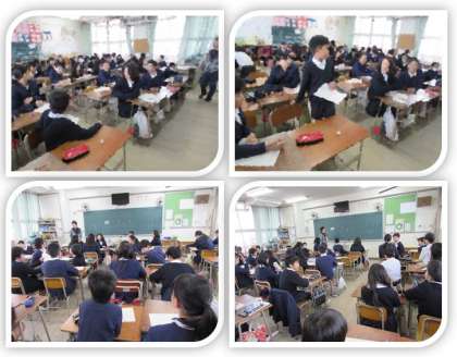 5年生の国語の学習です。「ぎょうにんべん」や「しんにょう」など、同じ部首の漢字を集め、班ごとにその数を競っています。