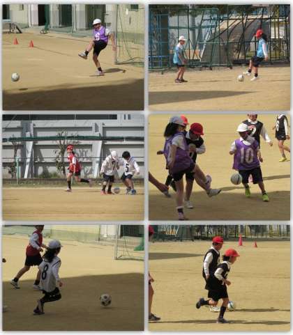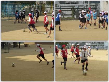 4年生の体育の学習です。暖かな日差しの中、運動場でサッカーのゲームを行っています。