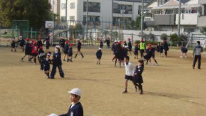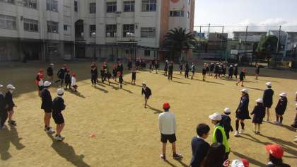 王様じんとりは、1年生と6年生が手をつないで走り回りました。