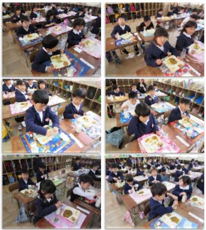 1年生の給食の様子です。今日は、自分で牛乳びんのふたを開けられた子も、増えました。