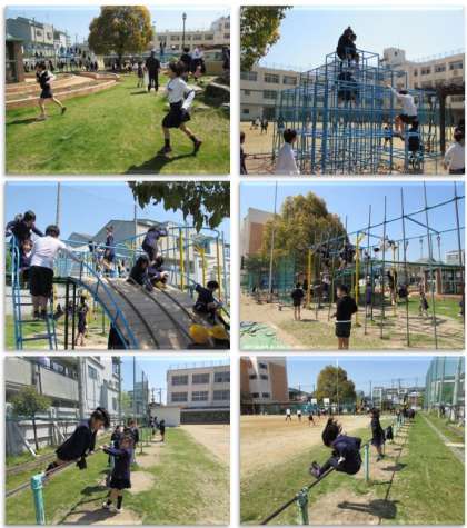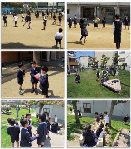休み時間になりました。子どもたちが運動場に飛び出してきました。運動場での遊び方を学習した1年生も、遊具で遊んだり、双子山で遊んだり、ボールで遊んだりしていました。