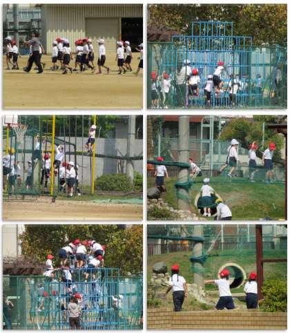 1年生の体育の学習です。体操服に着替えて運動場に出、初めに遊具や双子山で遊びました。次に、コーンを置いて、走って回ってくるゲームを行いました。