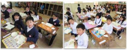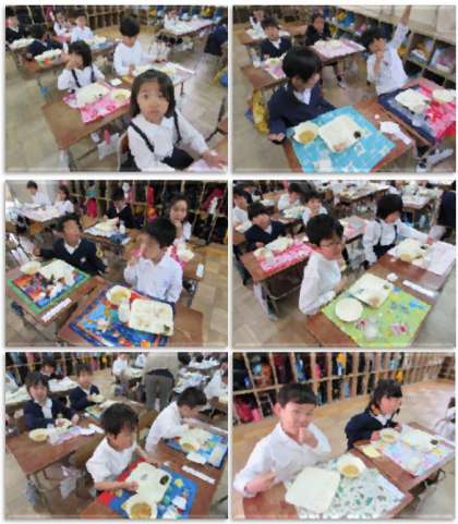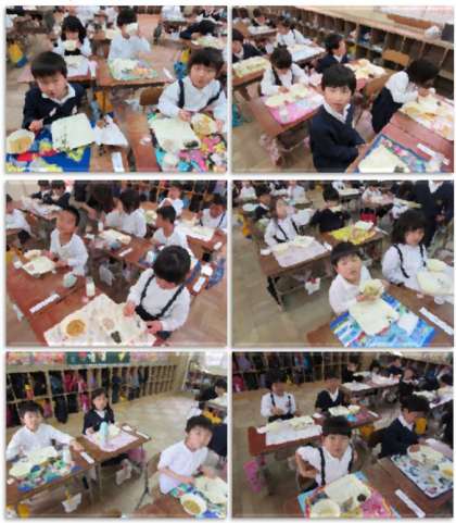 給食をいただく1年生です。配膳するのも、食べるのも、とっても上手になりました。