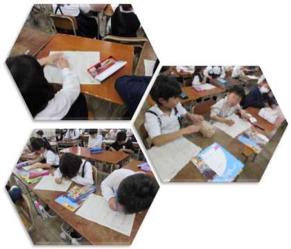 千本小学校では、5時間目が始まる前の5分間を「帯タイム」とし、計算の習熟のための時間としています。画像は、計算プリントに取り組む3年生の様子です。