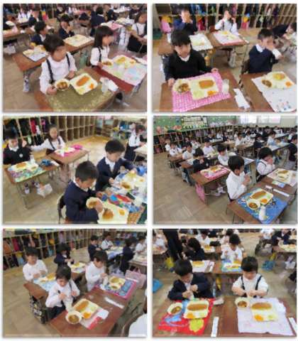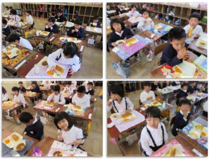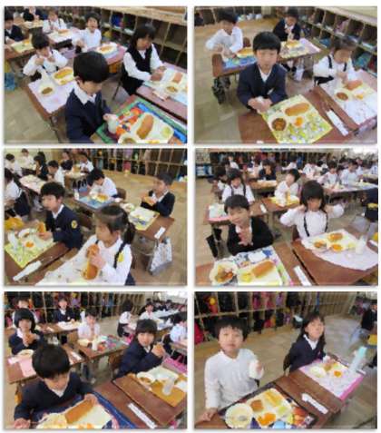 1年生の給食の様子です。「今日の給食パンは、なんだか色が違うね。何の色だか、わかりますか?」と尋ねると、「かぼちゃ」と返ってきます。「かぼちゃって、英語で何というか、知っていますか?」と尋ねると、元気な声で「パンプキン!」と、返ってきました。